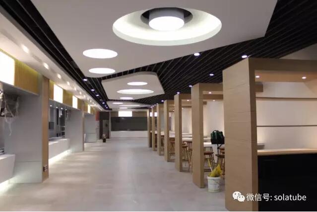 设计师匠心独运,在地下一层的餐厅中引入了纯净的自然光,索乐图导光管采光系统错落有致地分布在不规则的吊顶设计中,突显出餐厅的空间层次感,加之吊顶用色大胆,黑与白的碰撞,因为有了日光照明,即使吊顶以黑色为主,整体空间也不会显得局促和闭塞,反而更加敞亮、别具格调。
